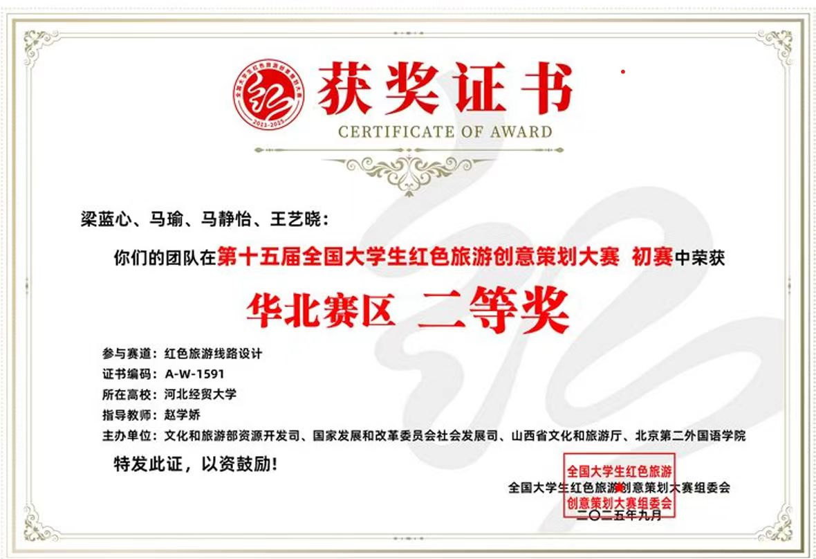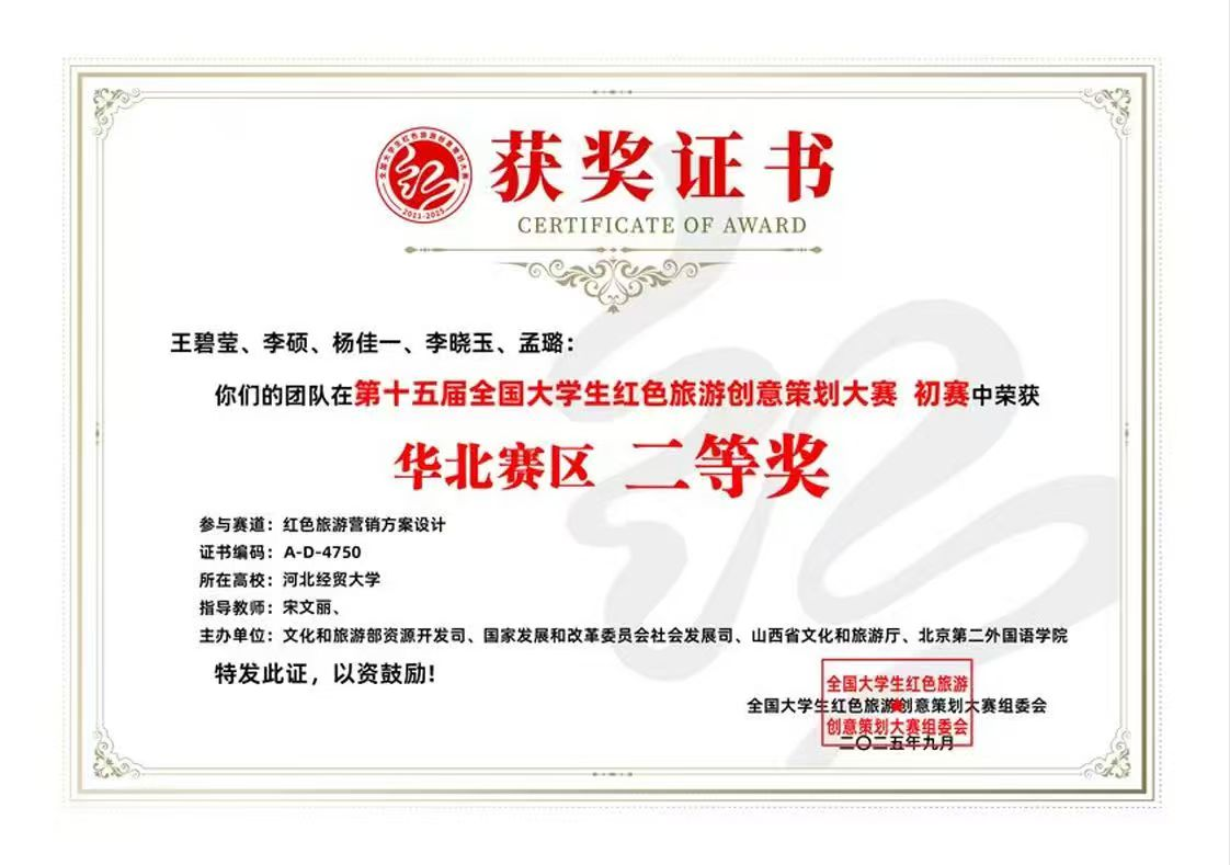 近日,第十五届全国大学生红色旅游创意策划大赛已圆满落幕,本届大赛自2025年4月启动,吸引了全国1001所高校、6002支队伍、3万余名师生参加,经过6个月的角逐,我院三支团队分别在红色旅游线路设计、红色旅游文创产品设计、红色旅游营销方案设计三大赛道斩获华北赛区二等奖,彰显应用型人才培养硬实力!